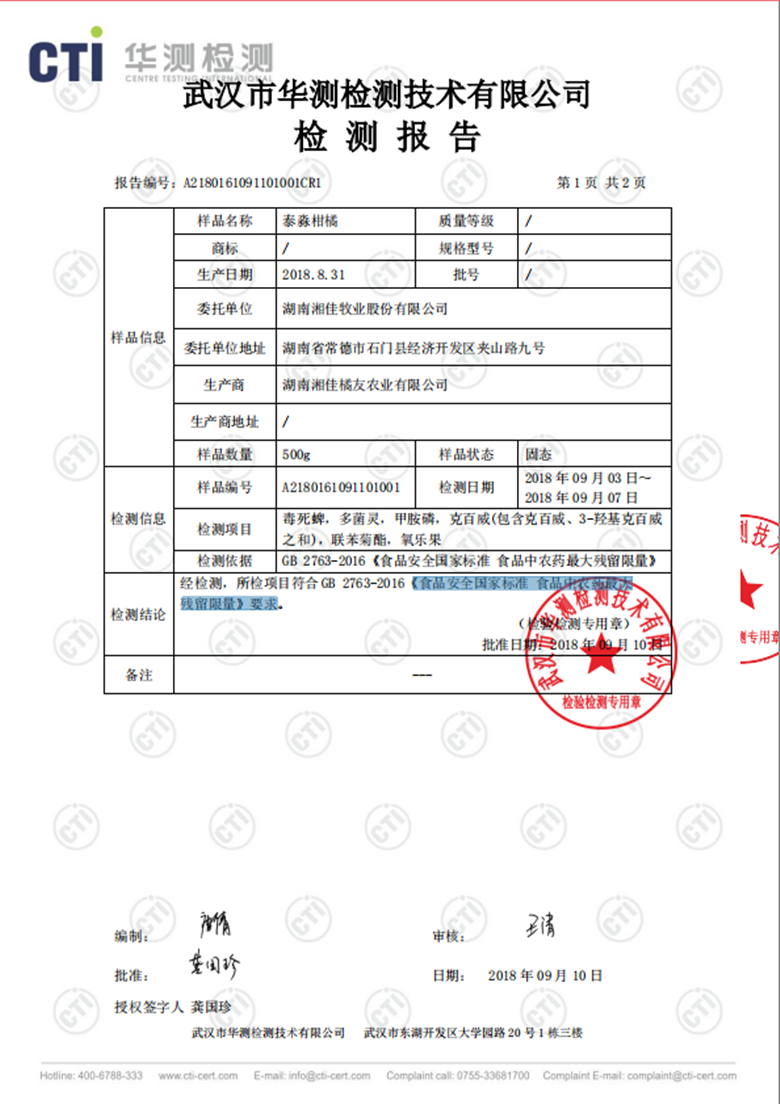 石門泰淼柑橘符合《食品安全國家標準,食品中農藥最大殘留限量》要求。