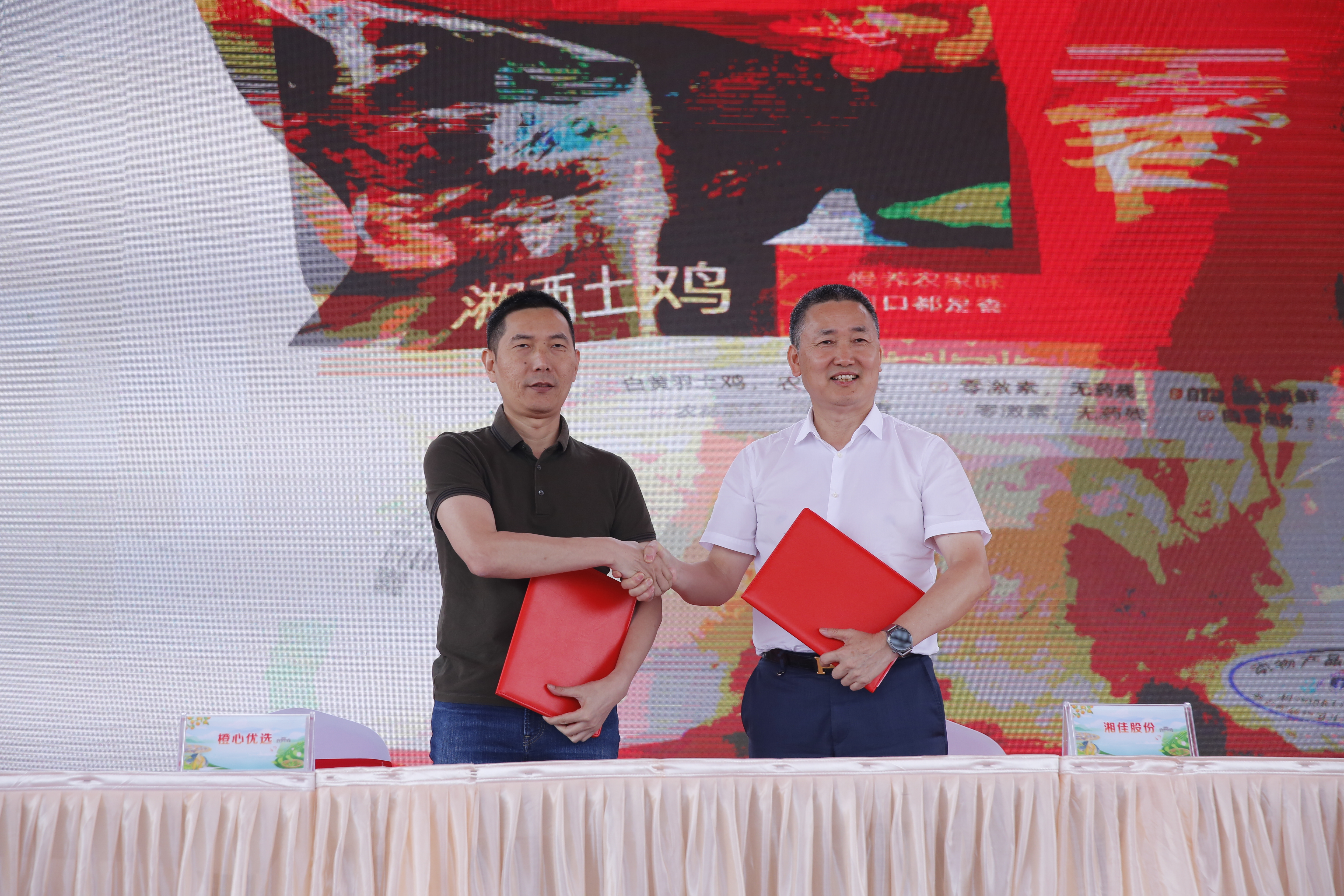 橙心優(yōu)選肉禽蛋水產(chǎn)品類總經(jīng)理余正友與湘佳股份董事長(zhǎng)喻自文簽署合作協(xié)議