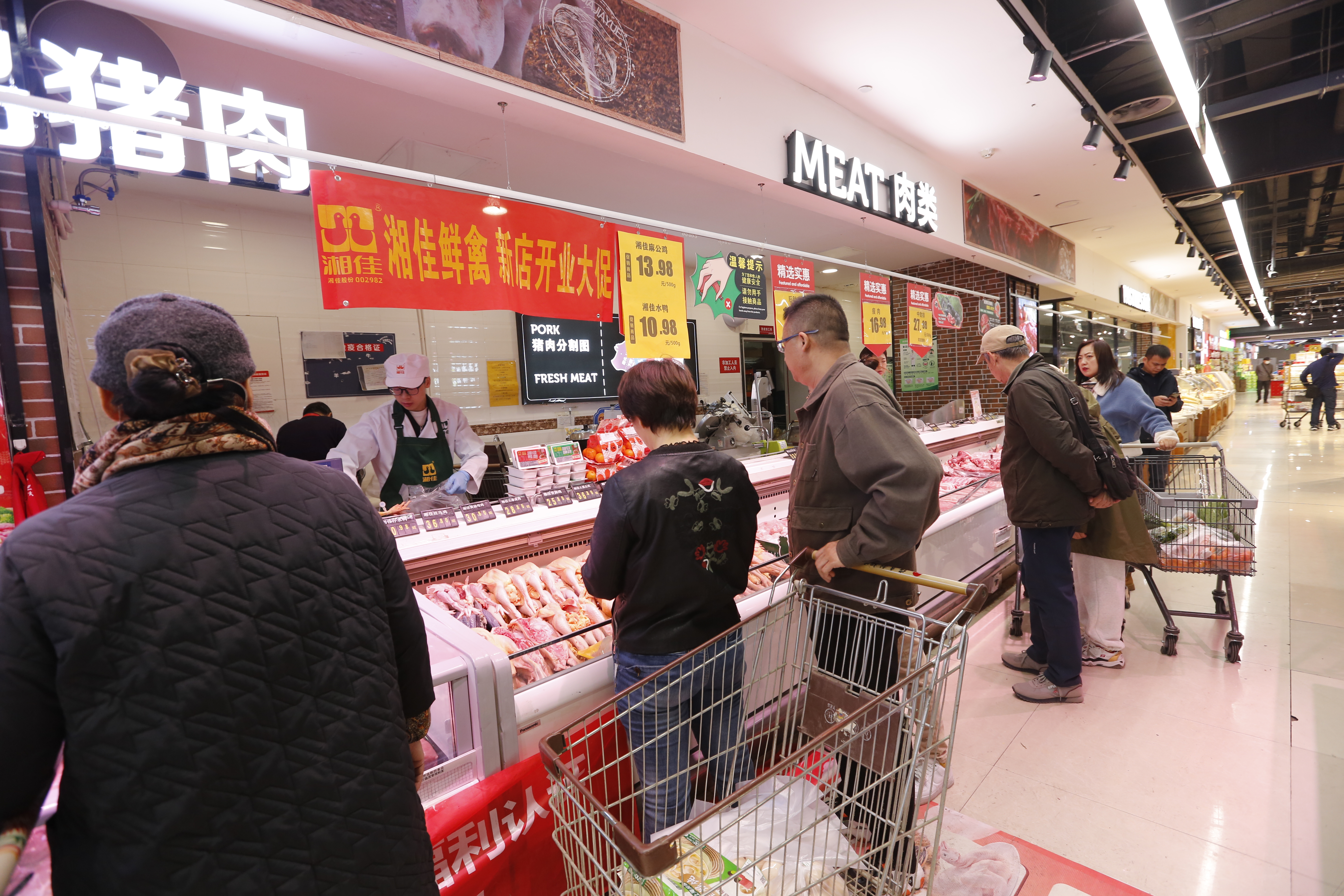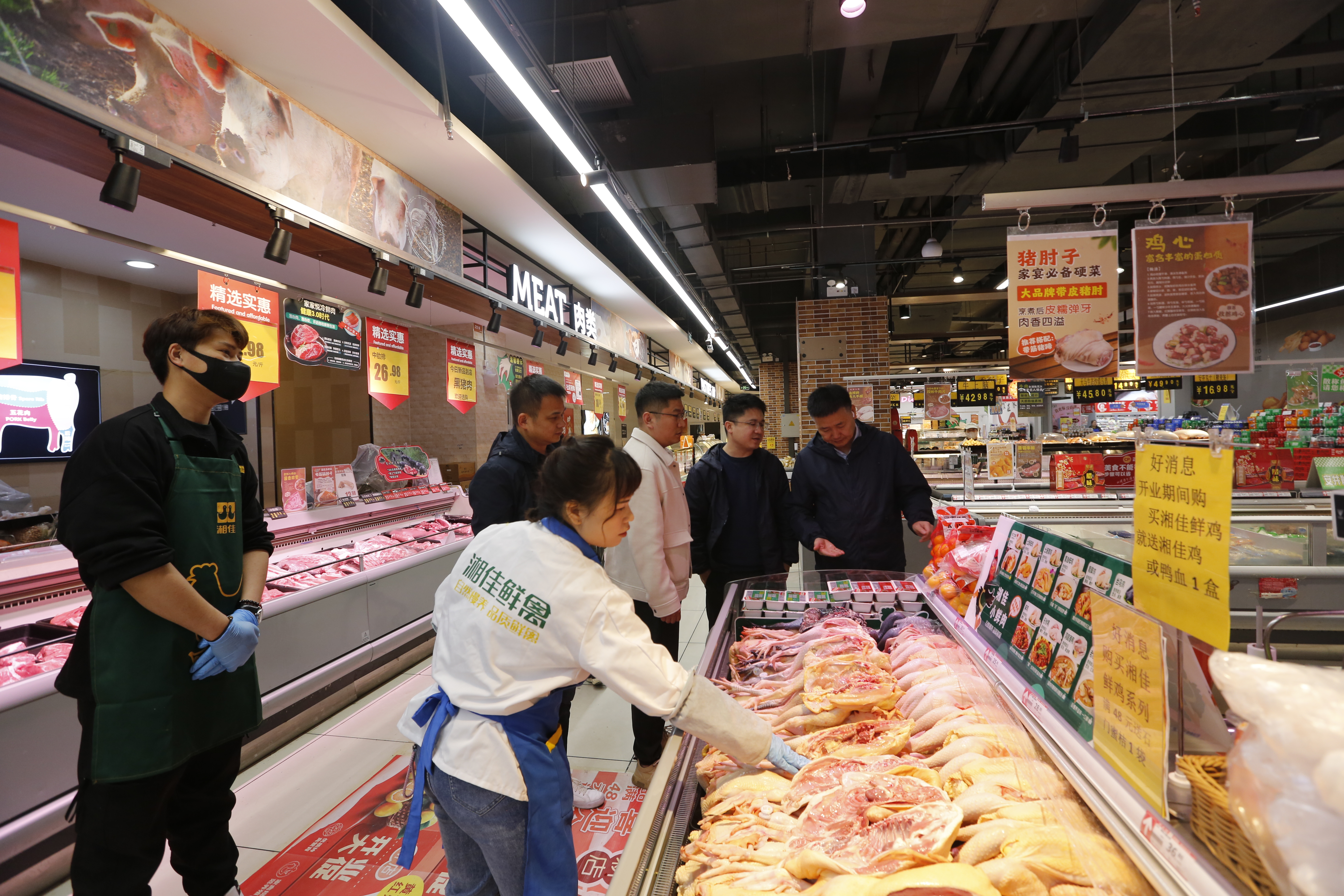 “從超市早上開門開始,就一直有顧客來詢問和購買我們公司的雞肉,第一天就在內(nèi)蒙古這個新市場搞了一個開門紅。”工作人員一邊忙著給顧客剁肉,一邊給湘佳股份董事長喻自文和副總裁趙柯程匯報首日銷售情況。